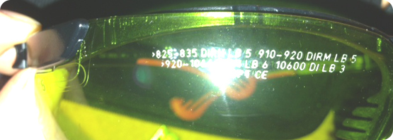 The above example is relatively basic and often the eyewear is tested at several wavelengths. This can result in several lines of detailed markings on the eyewear filters.